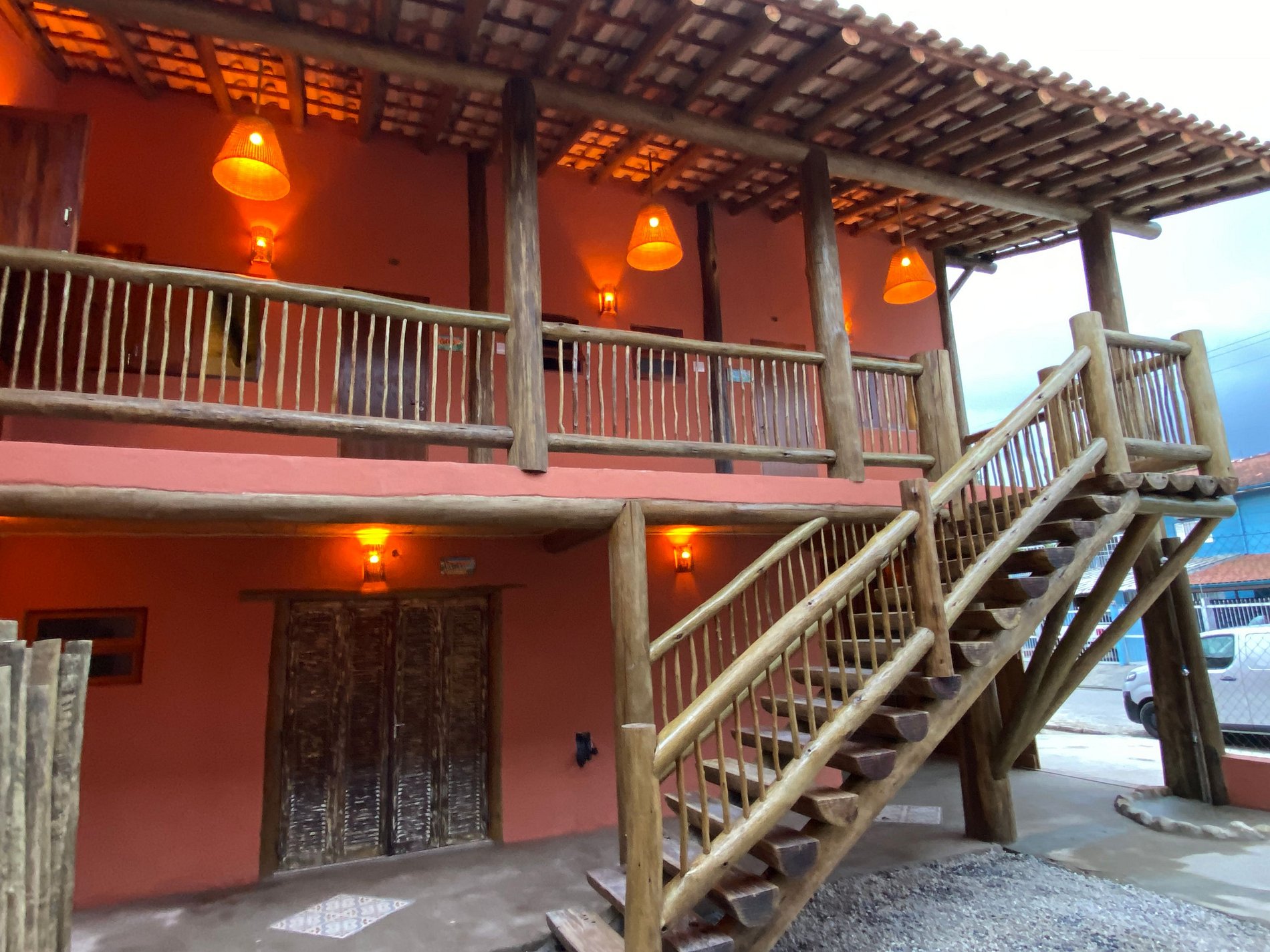 Estacionamento para os veículos na frente da pousada e câmeras de vigilância.